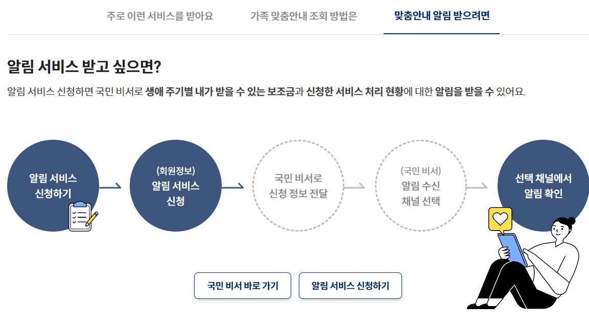 생애 주기별 내가 받을 수 있는 보조금과 신청한 서비스 처리 현황에 대한 알림을 받을 수 있기에,